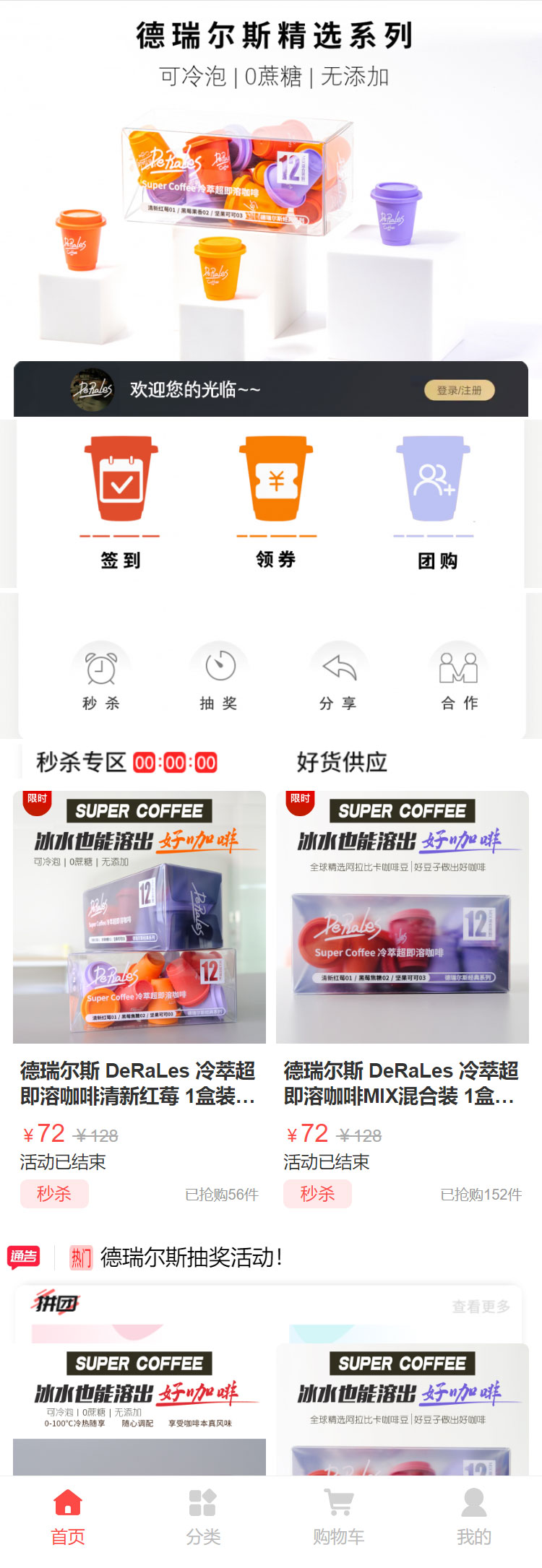 抽奖、签到、条件赠送、整点秒杀、团购、周期购、幸运拼团等模块